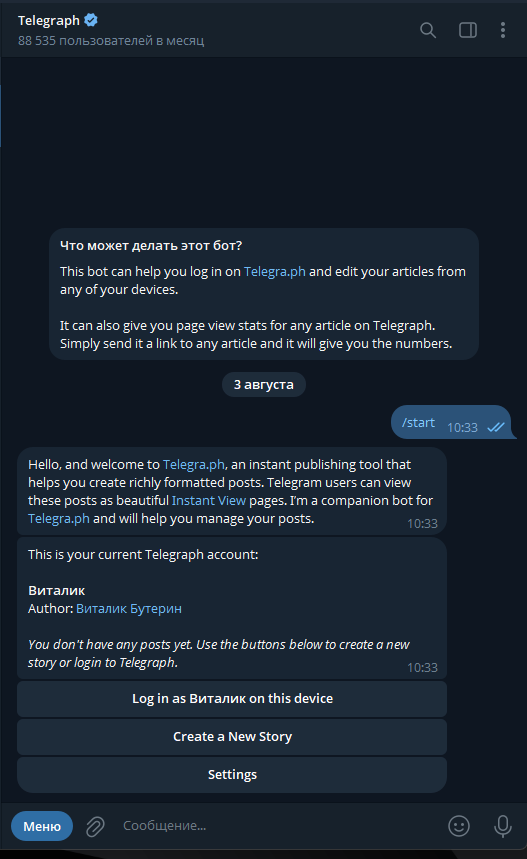Сервис также является частью ТГ и создан для тех кто любит писать длинные текста или даже статьи. По сути Telegraph это встроенный минималистичный в ТГ блог.