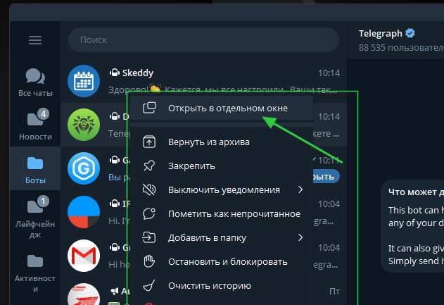 Немногие знают но в ТГ практически каждый чат можно открыть в отдельном окне. Это удобно если вы хотите контролировать сразу несколько переписок или при общении сразу с нескольких аккаунтов.