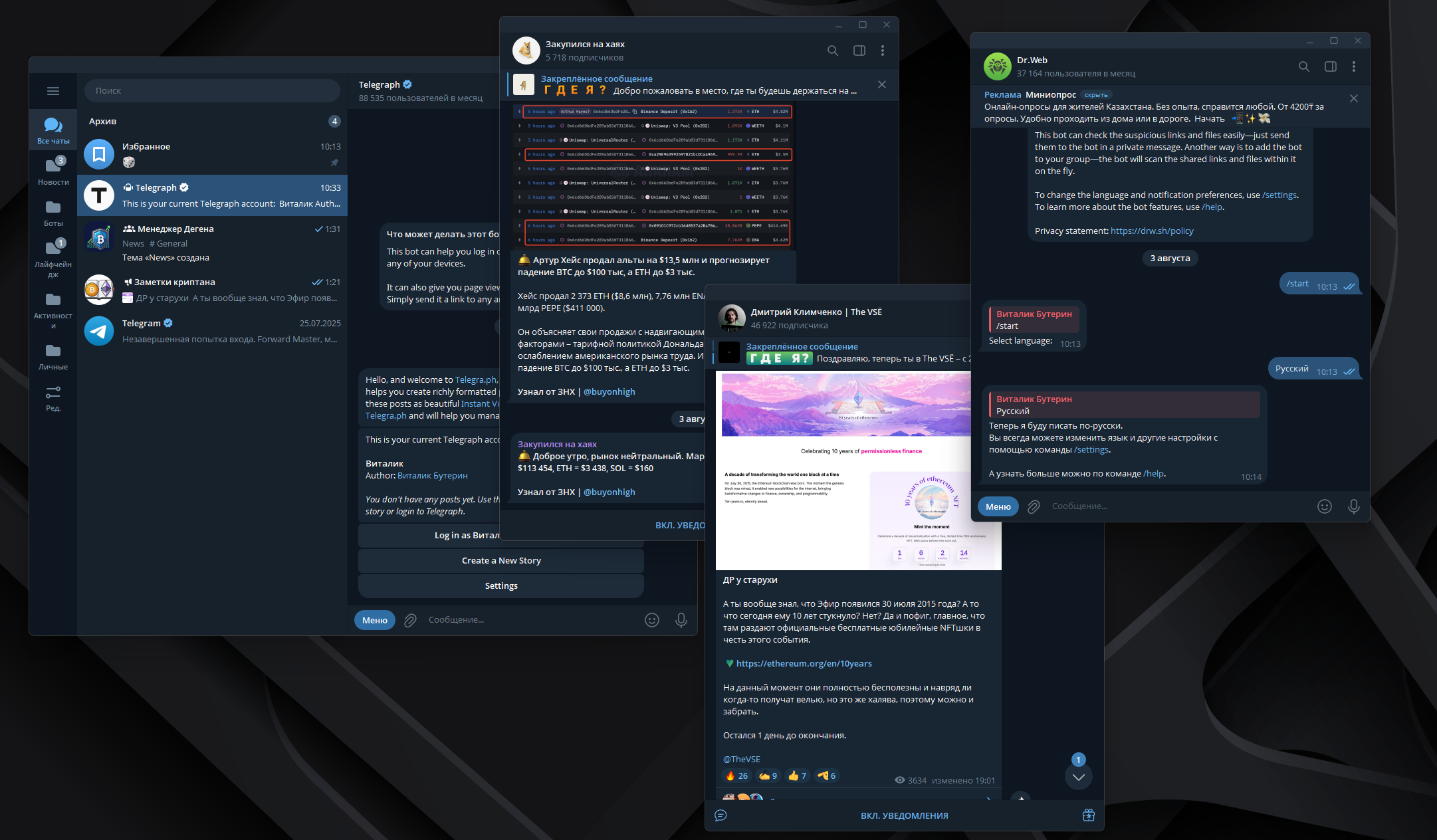 - Активно использует Telegram как рабочий инструмент или платформу для создания контента.