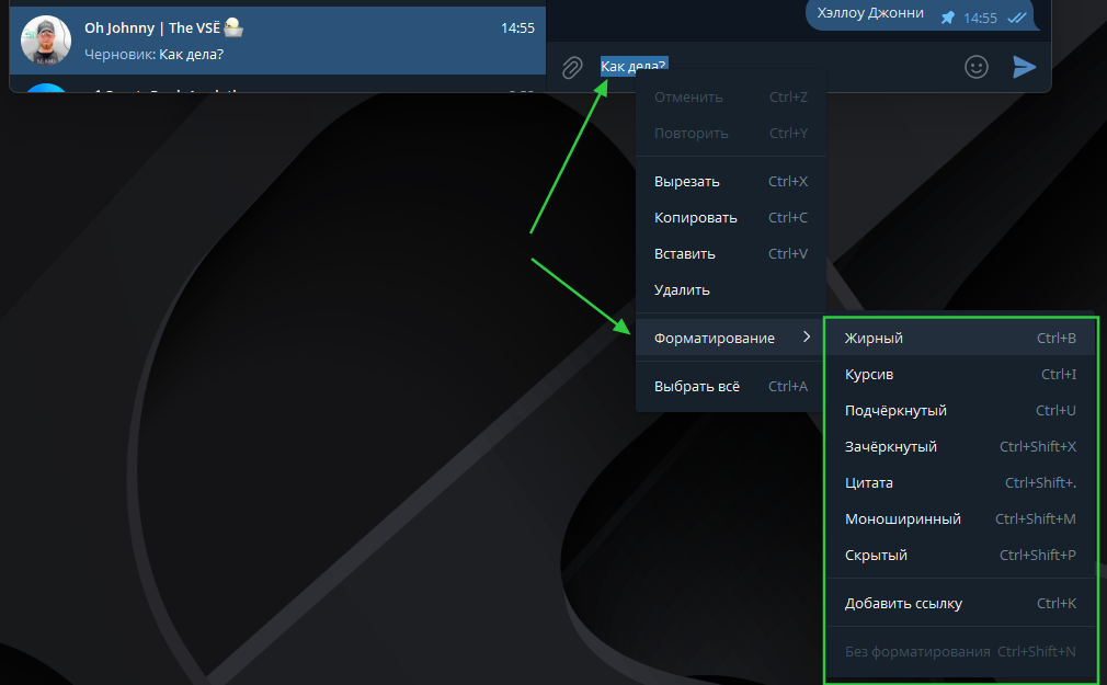 Также помимо отправки сообщений давайте обратим внимание на форматирование текста. Это пригодится при оформлении постов и для выделения текста в сообщении.